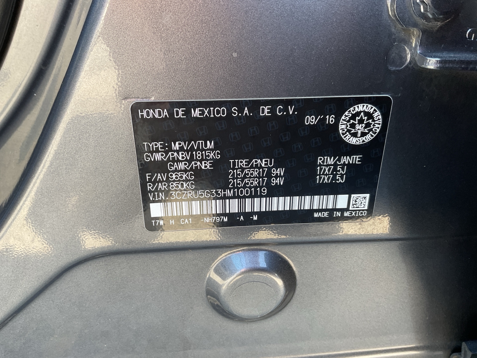 VIN: 3CZRU5G33HM100119